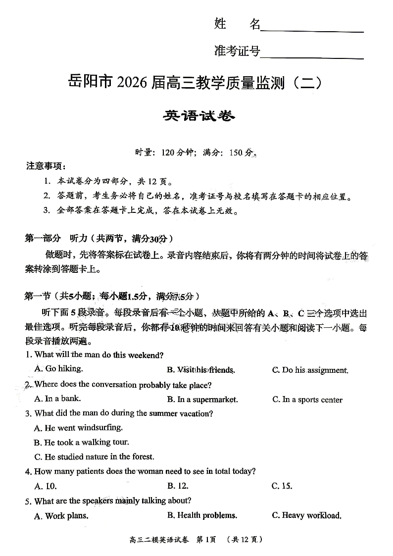 高三英语--湖南省岳阳市2026届高三4月教学质量监测(二)(岳阳二模)