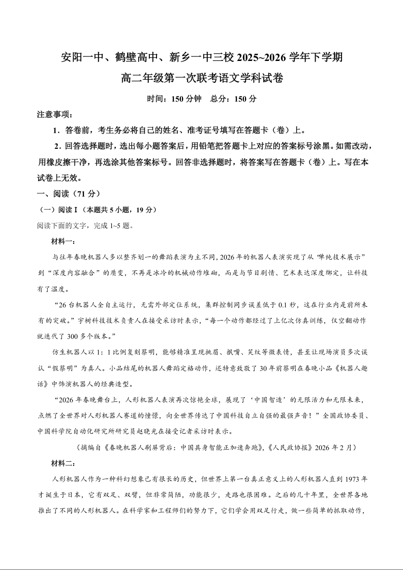 高二语文--河南省安阳一中、鹤壁高中、新乡一中三校2025~2026学年下学期高二年级第一次联考
