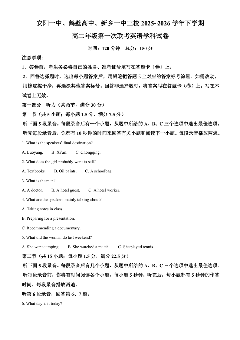 高二英语--河南省安阳一中、鹤壁高中、新乡一中三校2025~2026学年下学期高二年级第一次联考