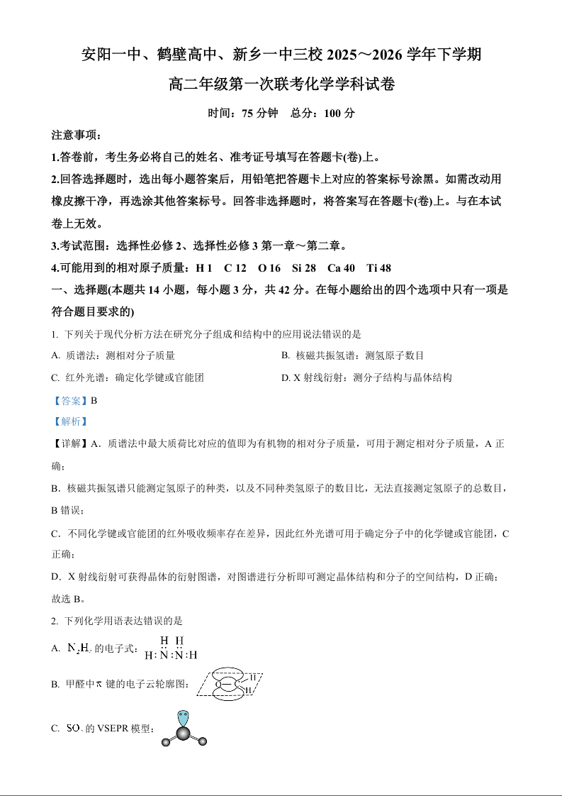 高二化学答案--河南省安阳一中、鹤壁高中、新乡一中三校2025~2026学年下学期高二年级第一次联考