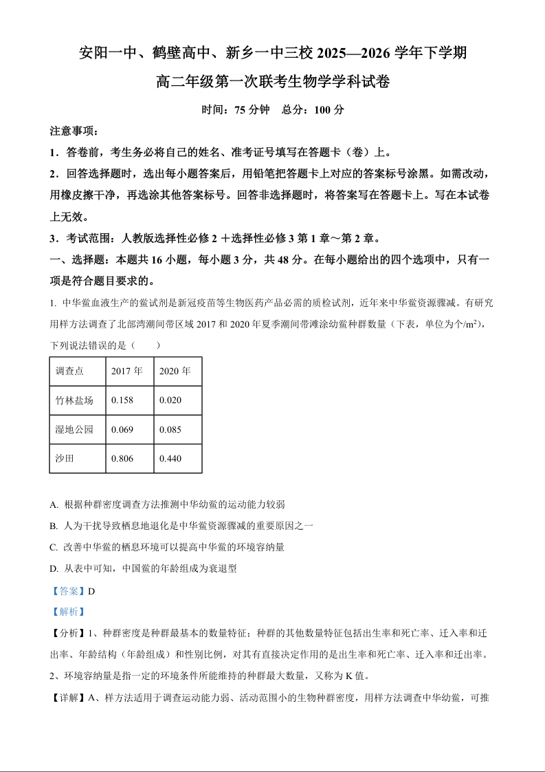 高二生物答案--河南省安阳一中、鹤壁高中、新乡一中三校2025~2026学年下学期高二年级第一次联考