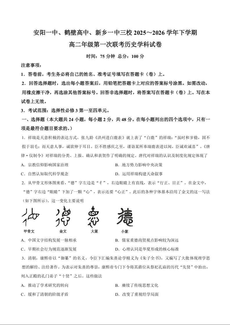 高二历史--河南省安阳一中、鹤壁高中、新乡一中三校2025~2026学年下学期高二年级第一次联考