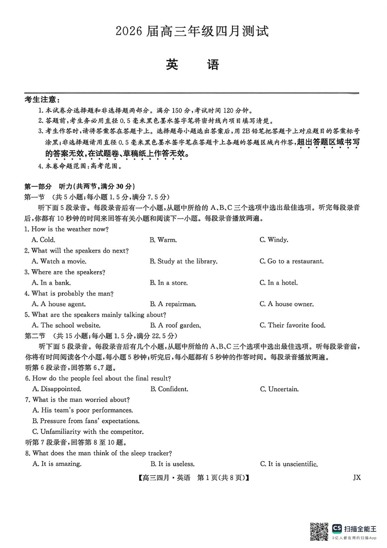 高三英语--九师联盟2026届高三年级下学期4月测试