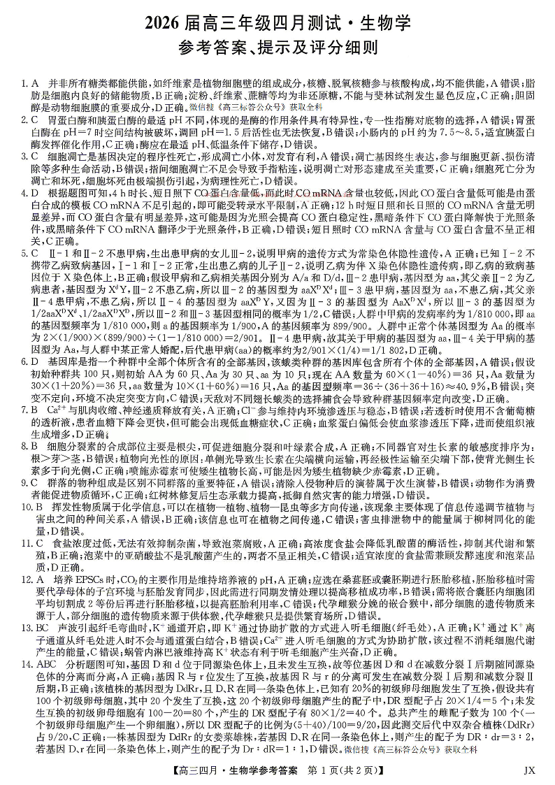 高三生物答案--九师联盟2026届高三年级下学期4月测试