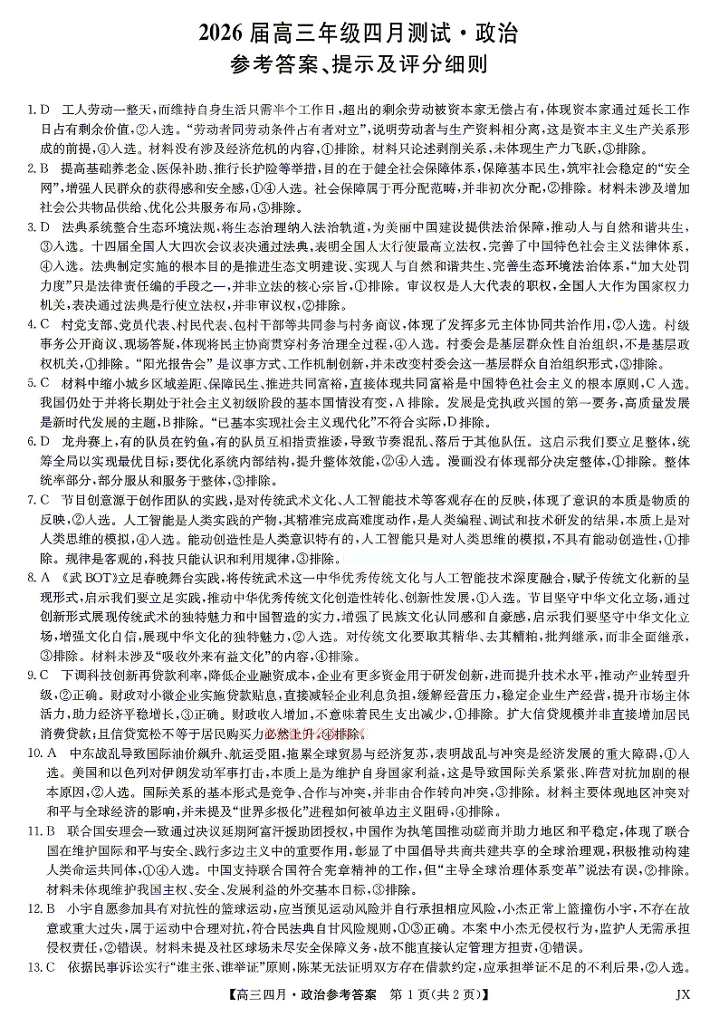 高三政治答案--九师联盟2026届高三年级下学期4月测试
