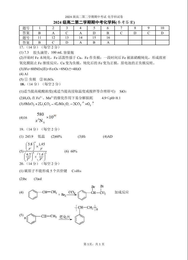 高二化学答案--广东省汕头市金山中学2025-2026学年高二下学期期中考试