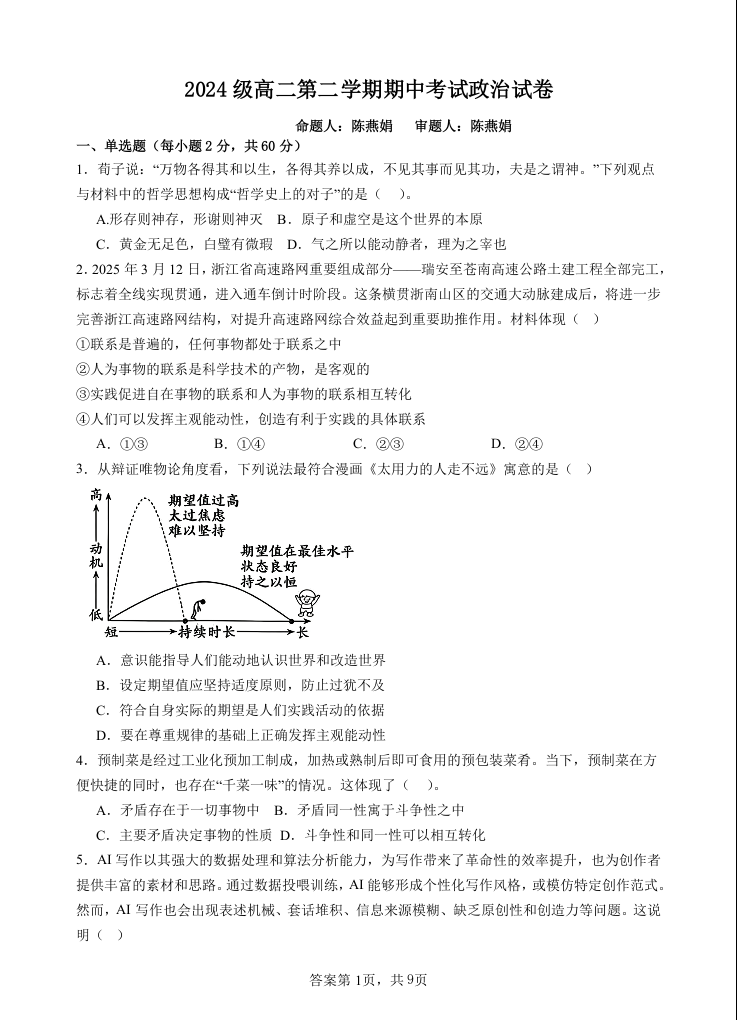 高二政治--广东省汕头市金山中学2025-2026学年高二下学期期中考试