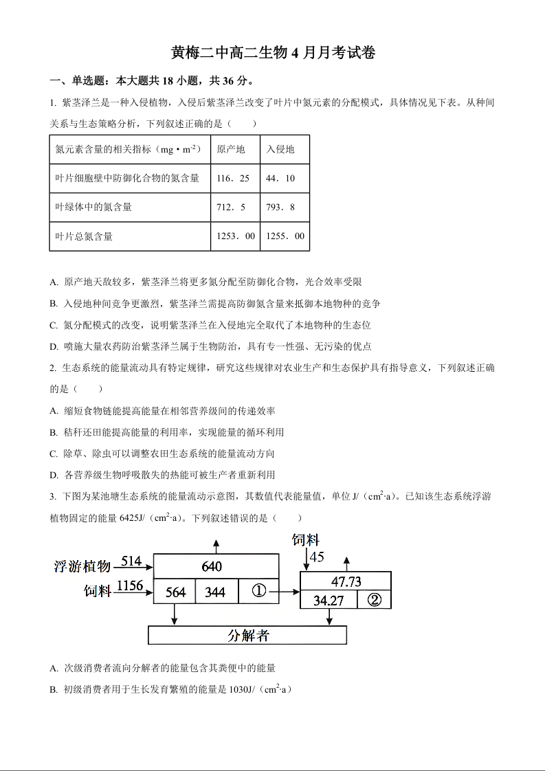 高三生物(原卷版)--湖北省黄冈市重点校2025-2026学年高二下学期4月月考