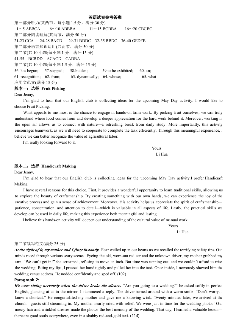 高二英语答案--湖北省武汉市洪山高级中学2025-2026学年高二下学期期中考试