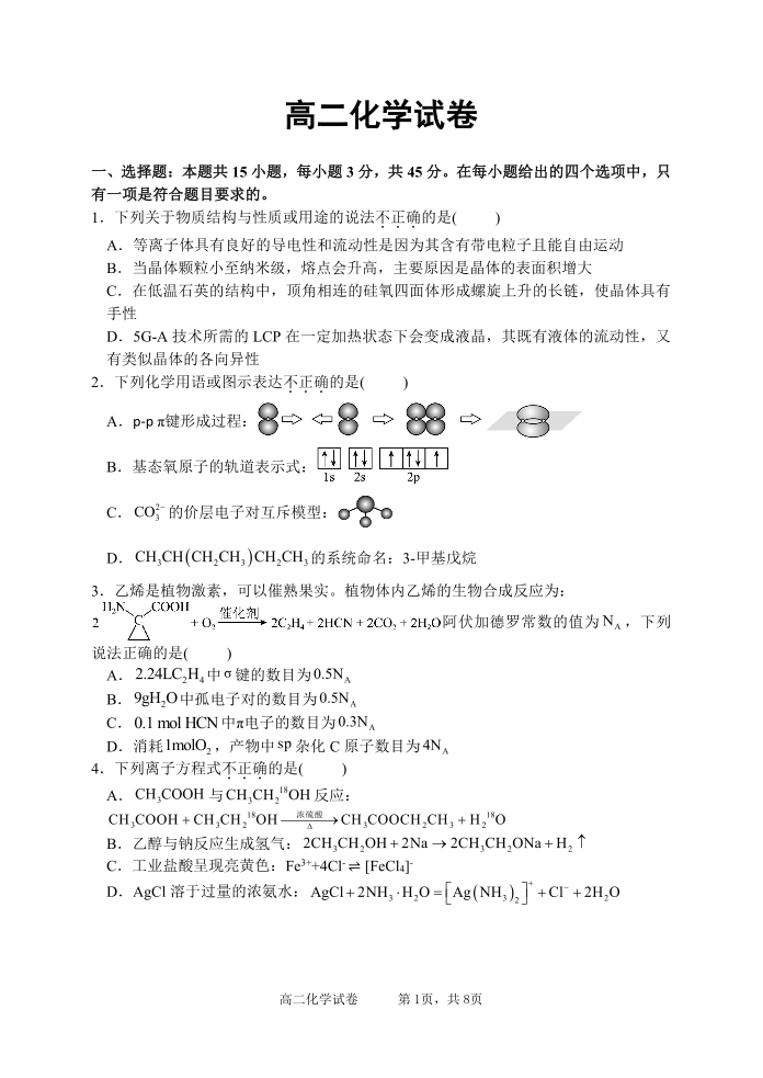 高二化学--湖北省武汉市洪山高级中学2025-2026学年高二下学期期中考试