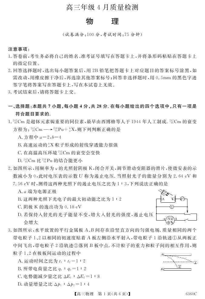 高三物理--湖南省天壹名校联盟2026届高三年级4月质量检测