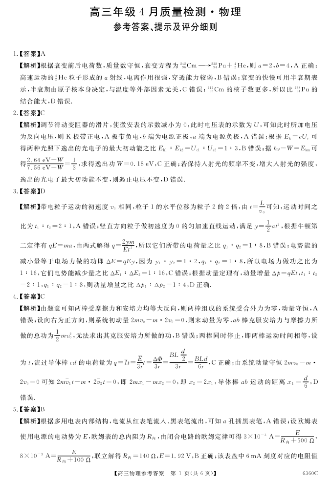 高三物理答案--湖南省天壹名校联盟2026届高三年级4月质量检测