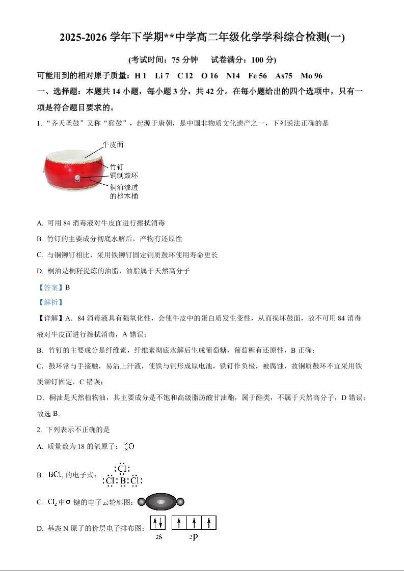 高二化学(解析版)--江西省赣州市四校2025-2026学年高二下学期综合检测联考(一)
