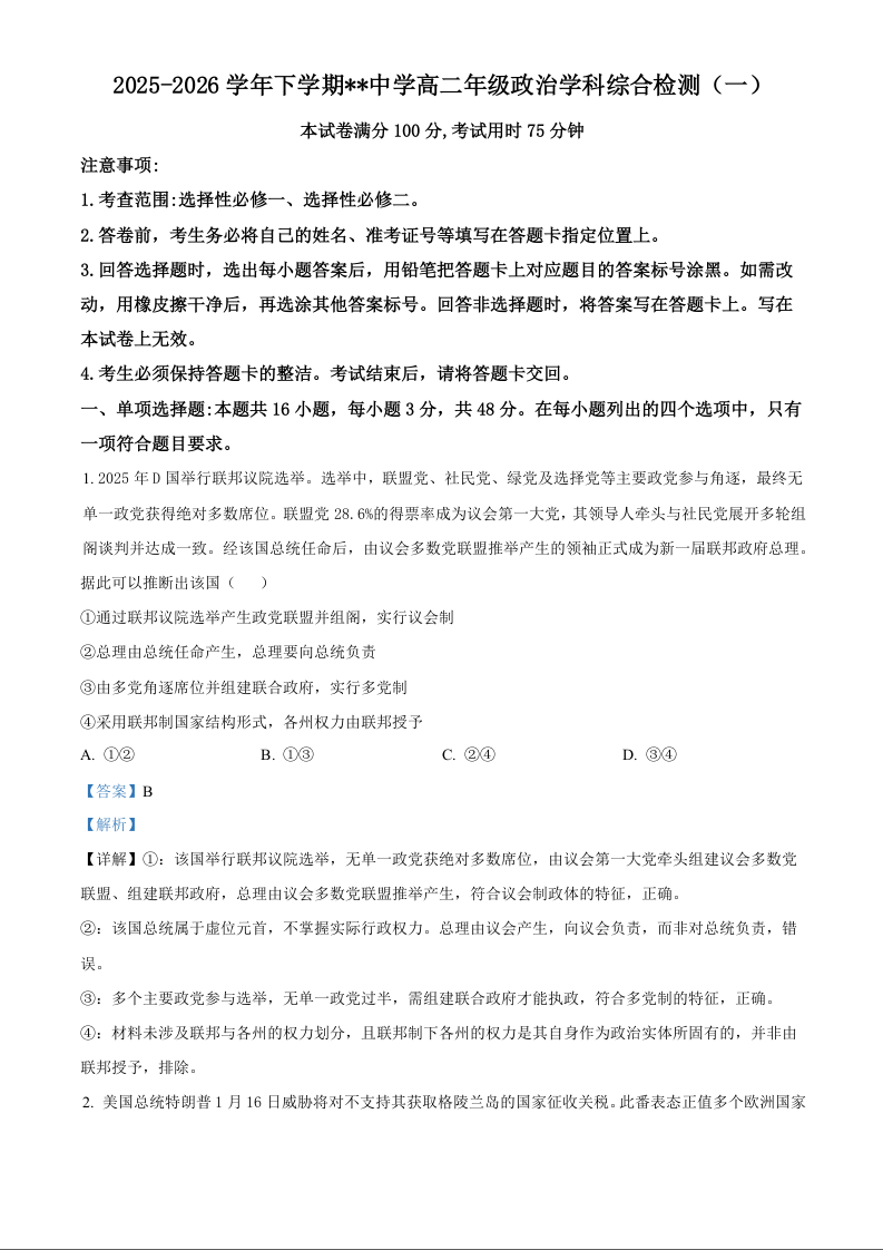 高二政治(解析版)--江西省赣州市四校2025-2026学年高二下学期综合检测联考(一)