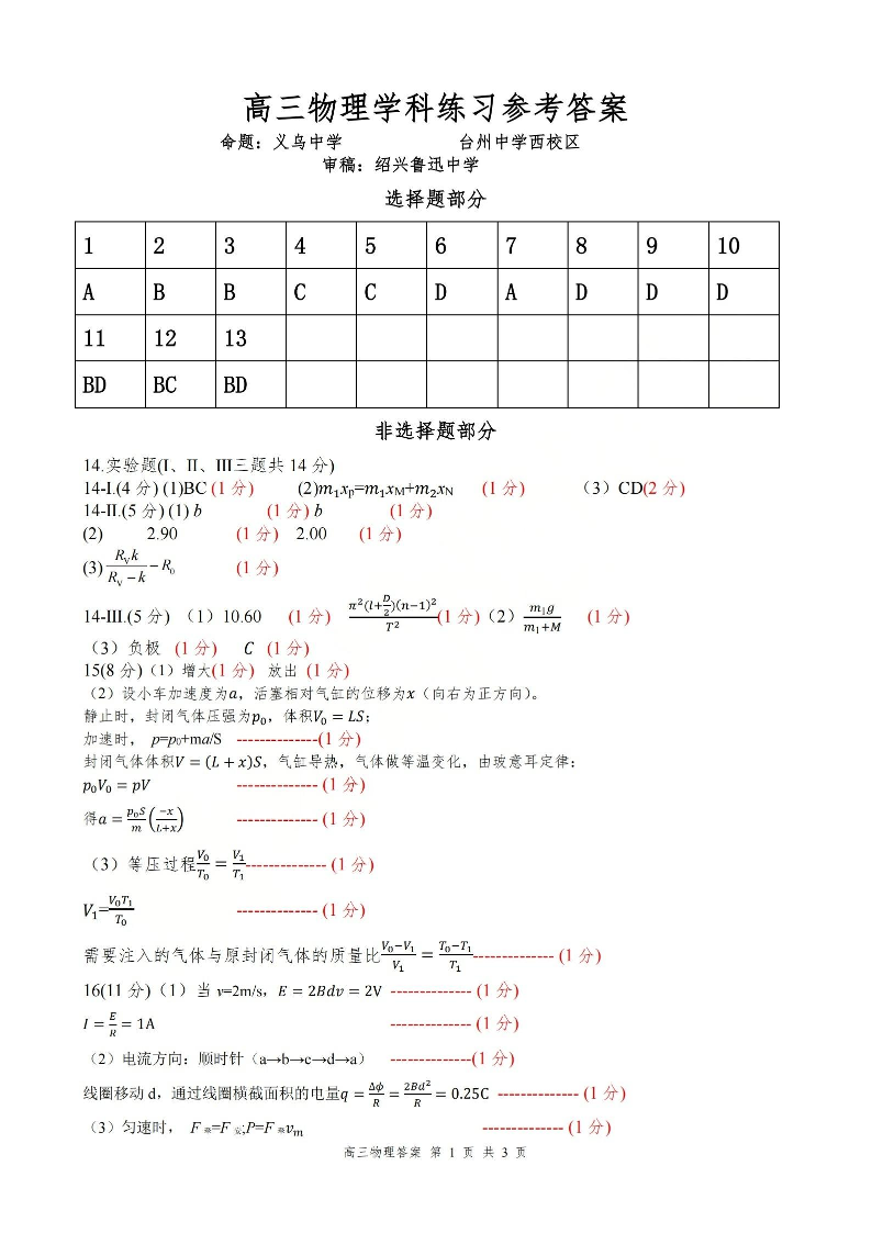 高三物理答案--天域全国名校协作体2026届高三4月联考