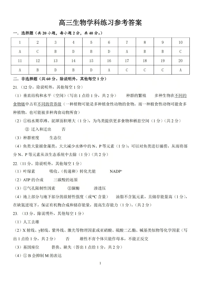 高三生物答案--天域全国名校协作体2026届高三4月联考