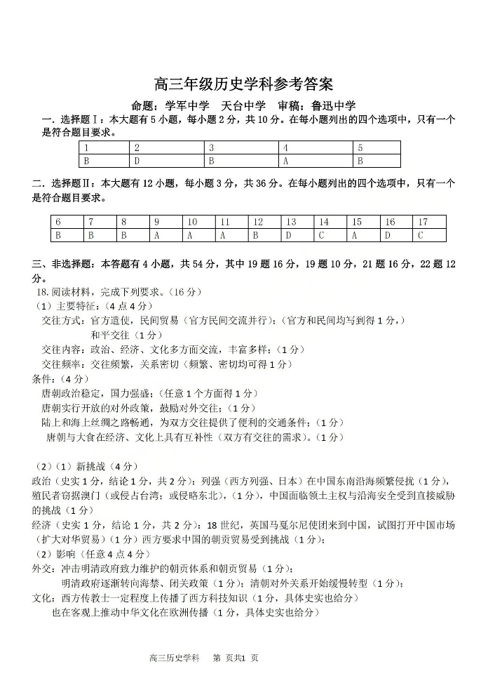 高三历史答案--天域全国名校协作体2026届高三4月联考