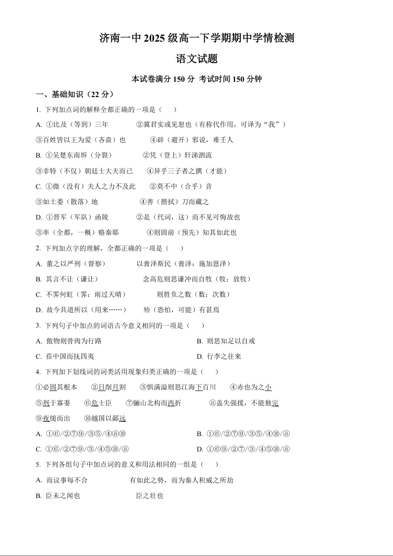 高一语文(原卷版)--山东省济南第一中学2025-2026学年高一下学期期中学情检测