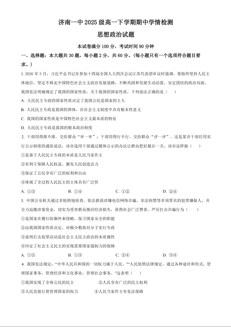 高一政治(原卷版)--山东省济南第一中学2025-2026学年高一下学期期中学情检测