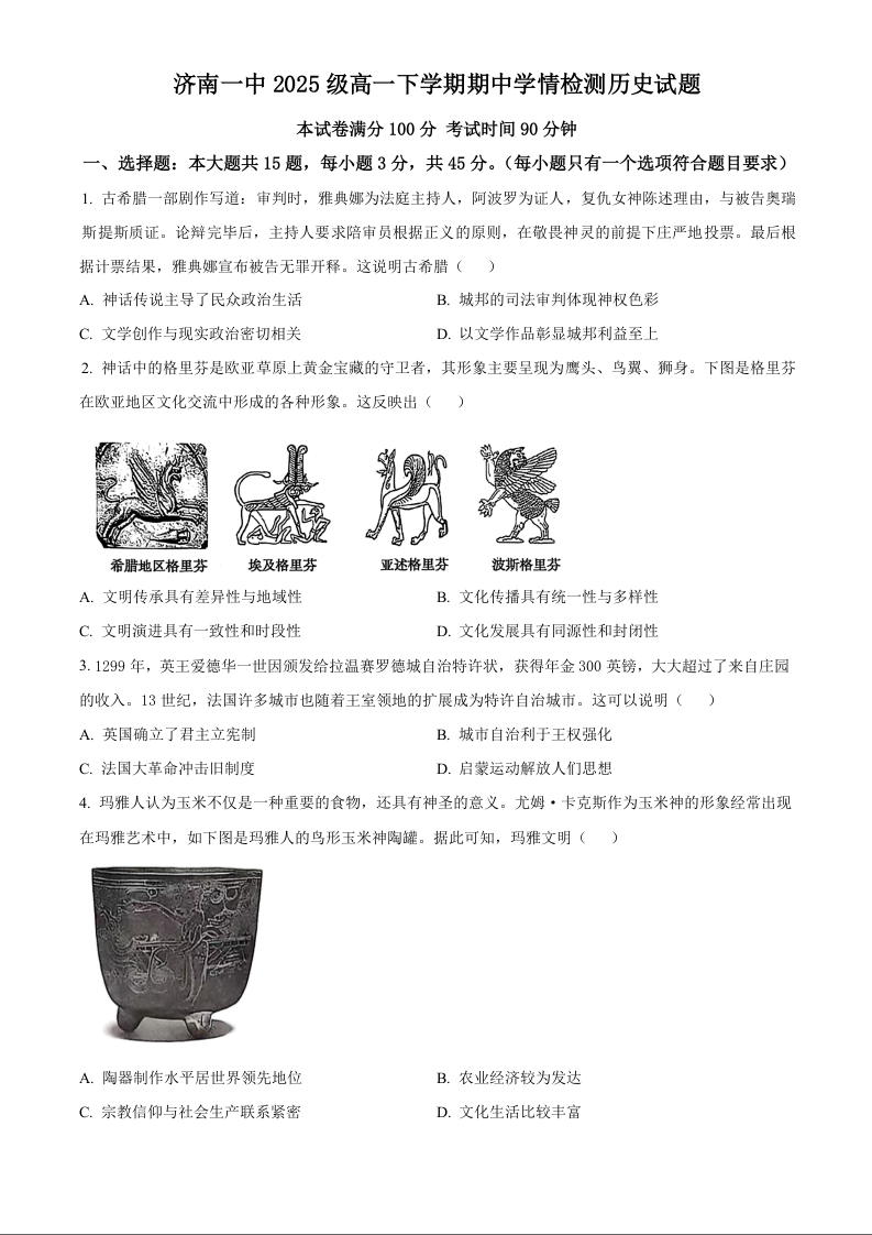 高一历史(原卷版)--山东省济南第一中学2025-2026学年高一下学期期中学情检测
