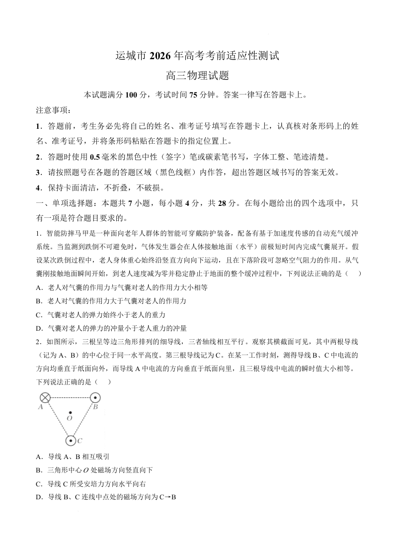 高三物理--山西省运城市2026 届高三4月高考考前适应性测试