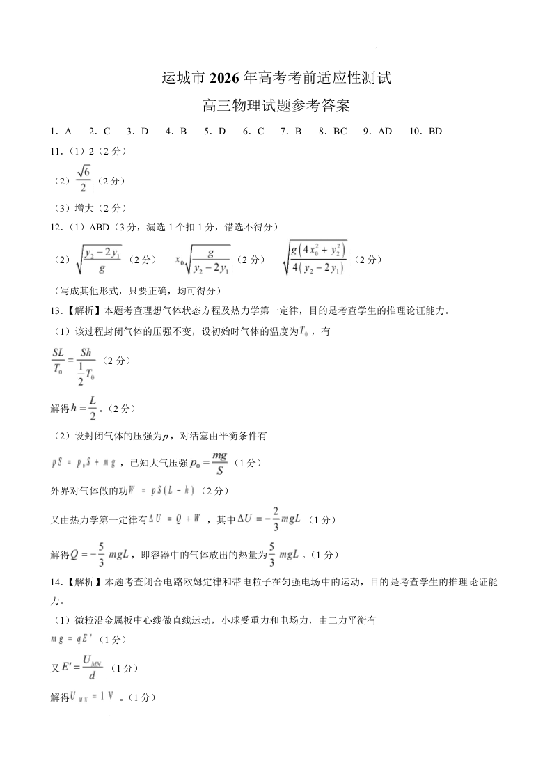 高三物理答案--山西省运城市2026 届高三4月高考考前适应性测试