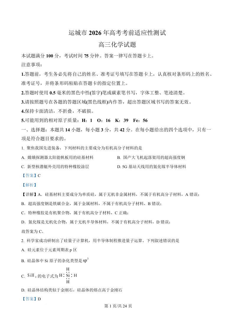 高三化学(解析版)--山西省运城市2026 届高三4月高考考前适应性测试