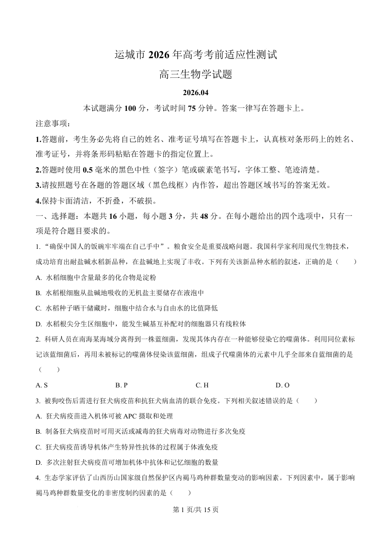 高三生物+答案--山西省运城市2026 届高三4月高考考前适应性测试