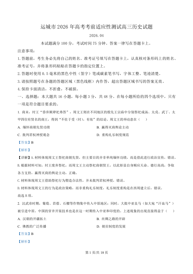 高三历史(解析版)--山西省运城市2026 届高三4月高考考前适应性测试