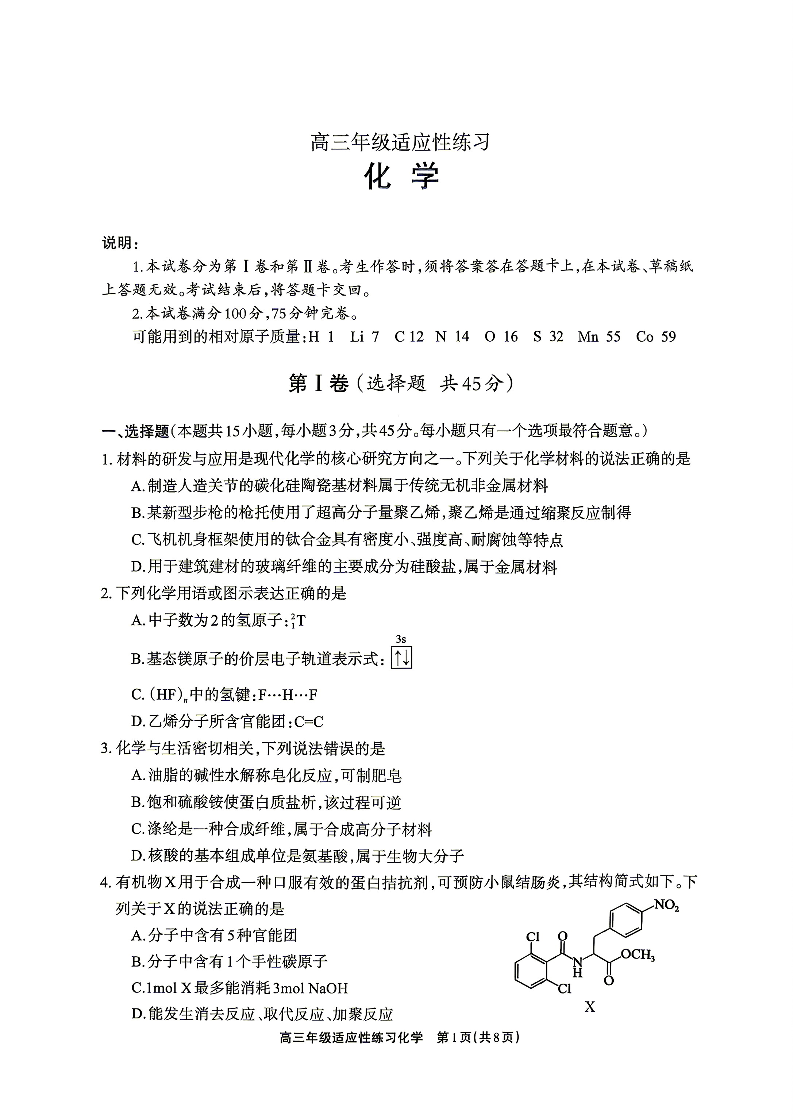 高三化学--四川省德阳市2026届高三年级适应性练习(德阳三诊)