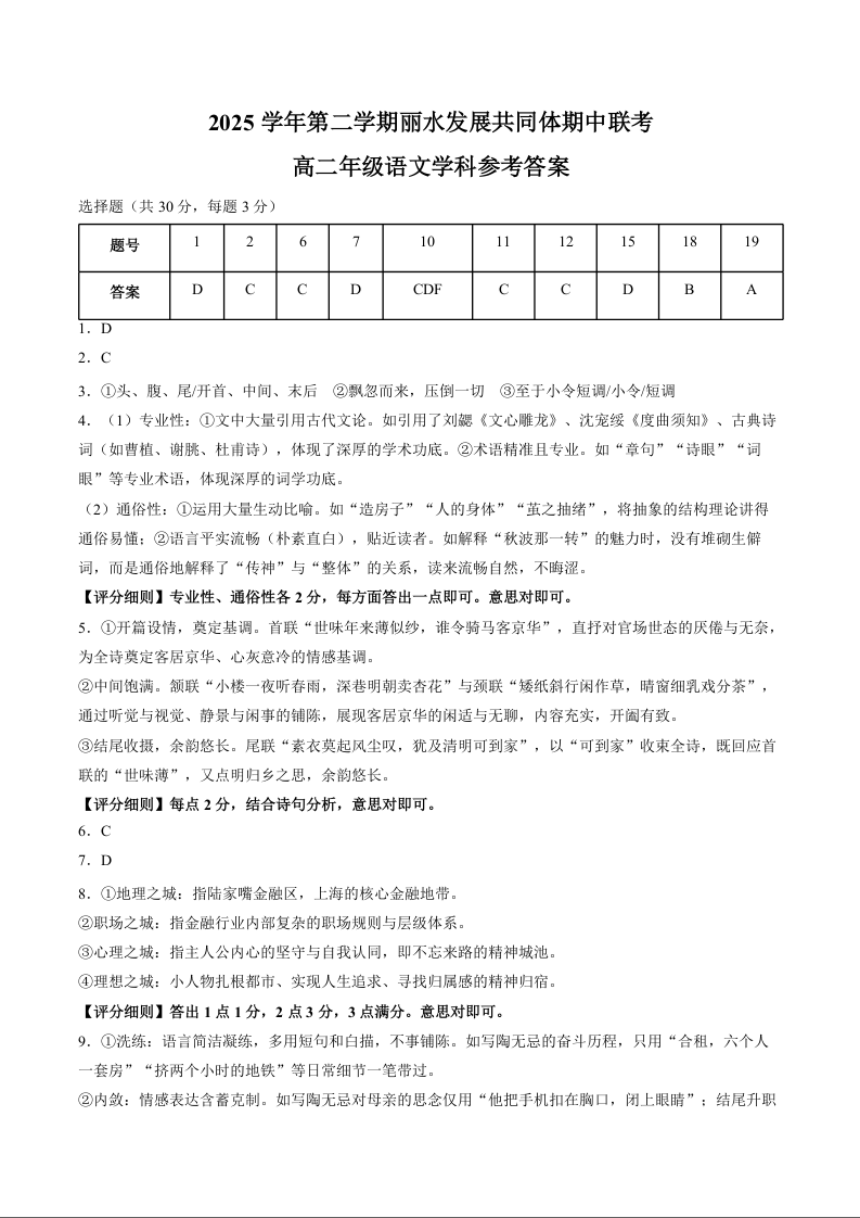 高二语文答案--浙江省丽水市丽水发展共同体2025-2026学年高二下学期4月期中地理试题
