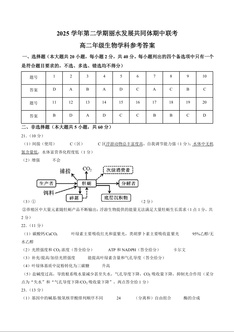 高二生物答案--浙江省丽水市丽水发展共同体2025-2026学年高二下学期4月期中地理试题