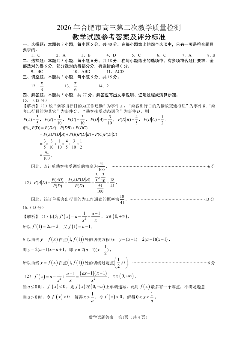 高三数学答案--安徽省合肥市2026届高三下学期第二次教学质量检测(合肥二模)