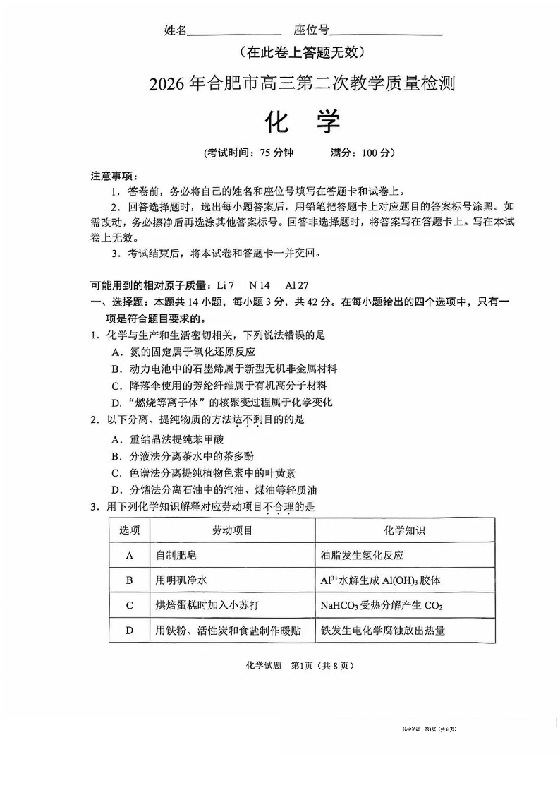 高三化学+答案--安徽省合肥市2026届高三下学期第二次教学质量检测(合肥二模)