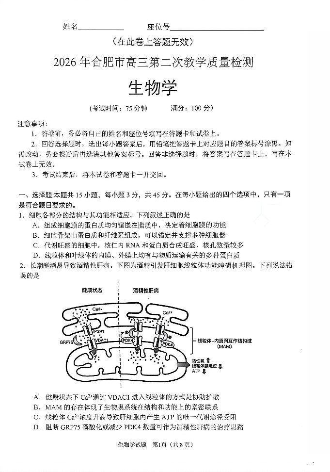 高三生物+答案--安徽省合肥市2026届高三下学期第二次教学质量检测(合肥二模)