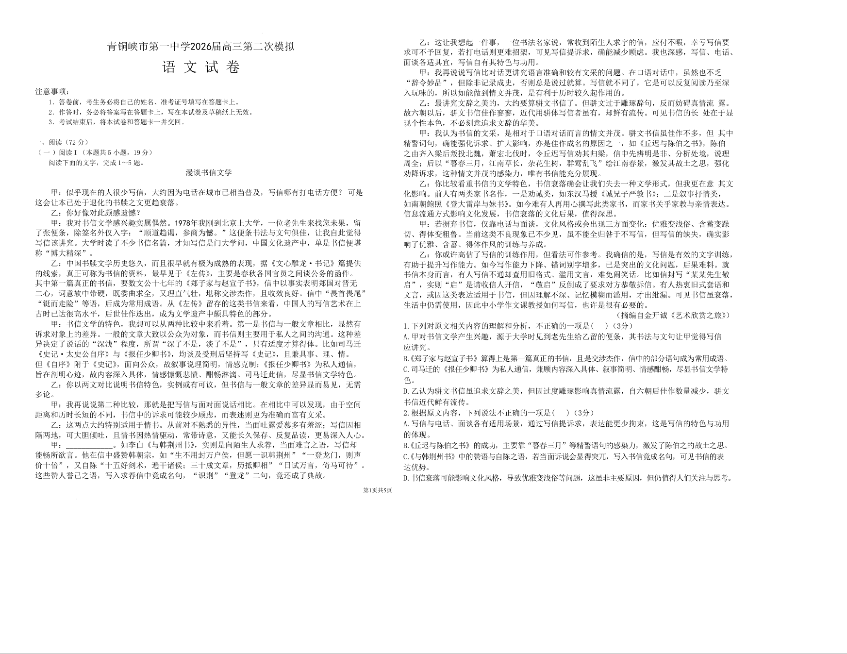 高三语文--宁夏吴忠市青铜峡市第一中学2026届高三下学期第二次模拟考试