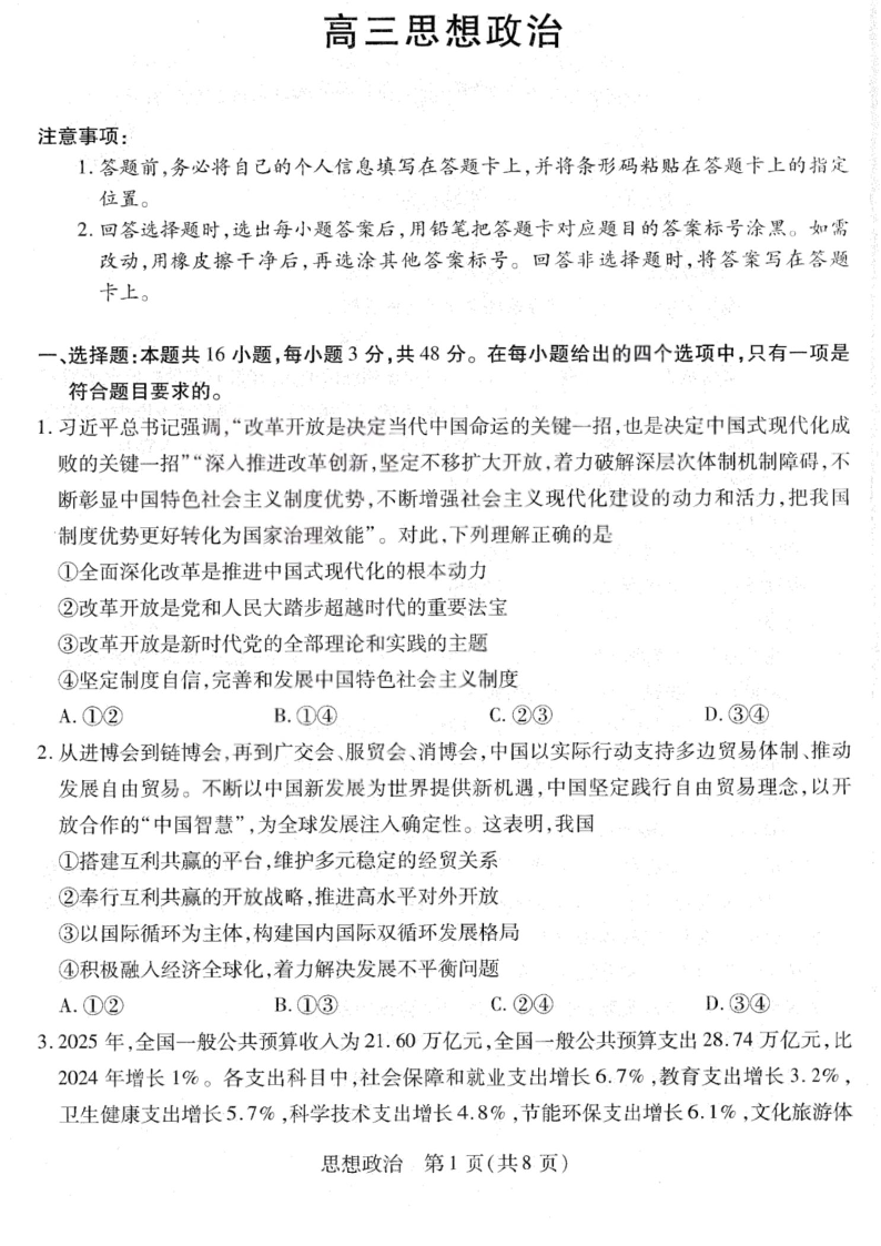 高三政治+答案--山西、陕西省天一大联考2026届高三下学期4月23-24联考