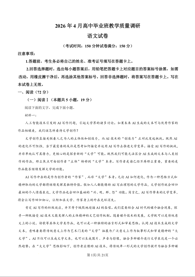 高三语文(精品解析版)--广西南宁市2026届高三4月高中毕业班教学质量调研