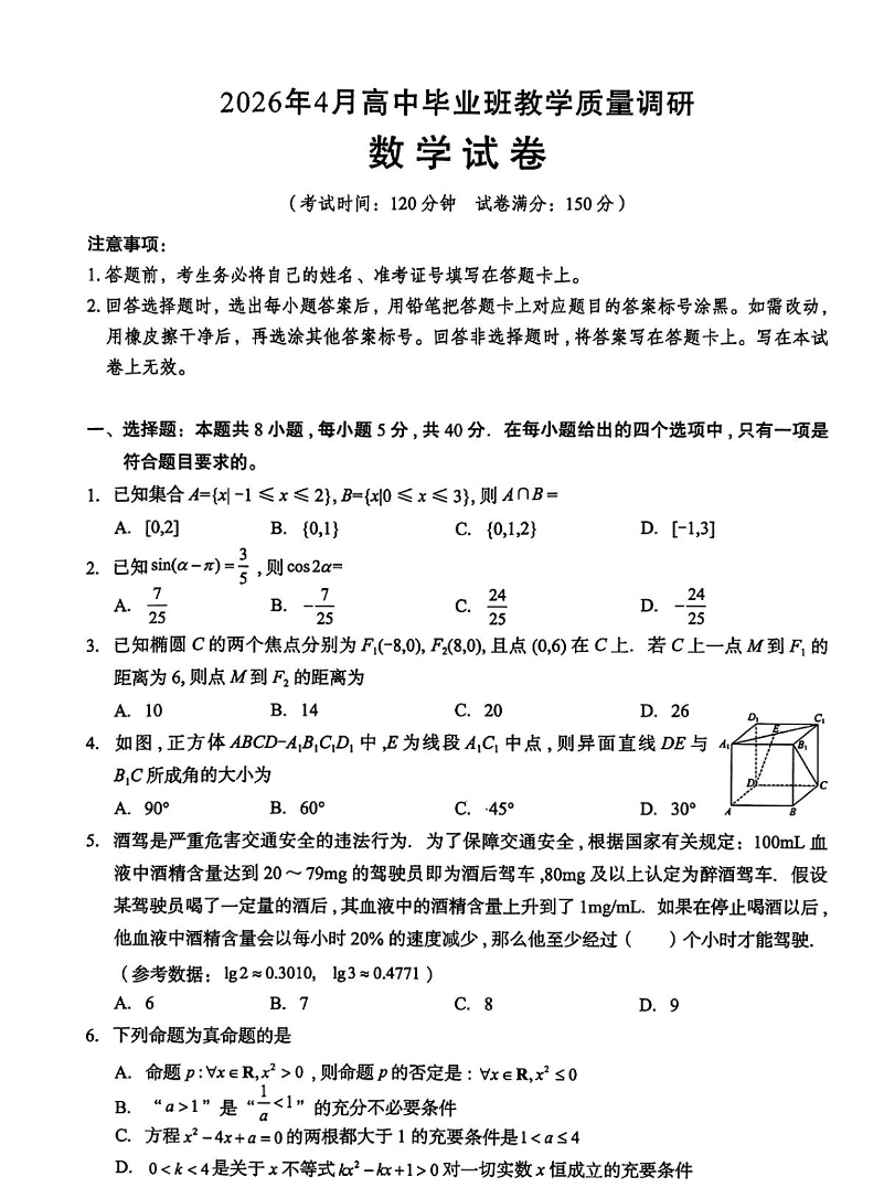 高三数学+答案--广西南宁市2026届高三4月高中毕业班教学质量调研