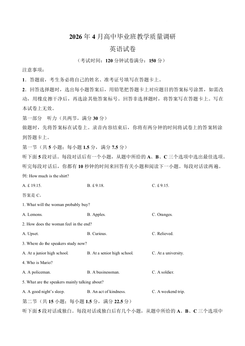 高三英语--广西南宁市2026届高三4月高中毕业班教学质量调研