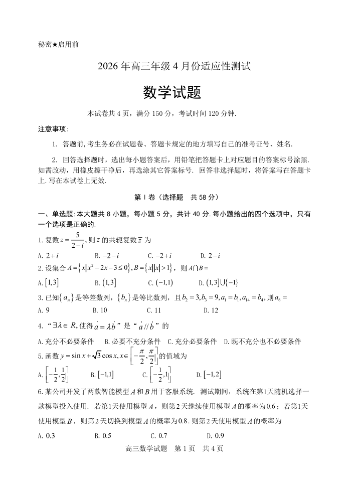 高三数学--山东省东营市2026届高三4月适应性测试(东营二模)