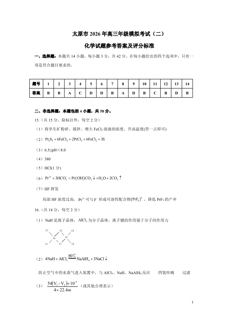 高三化学答案--山西省太原市2026届高三模拟考试(二)(太原二模)