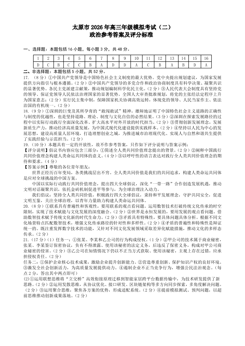 高三政治答案--山西省太原市2026届高三模拟考试(二)(太原二模)