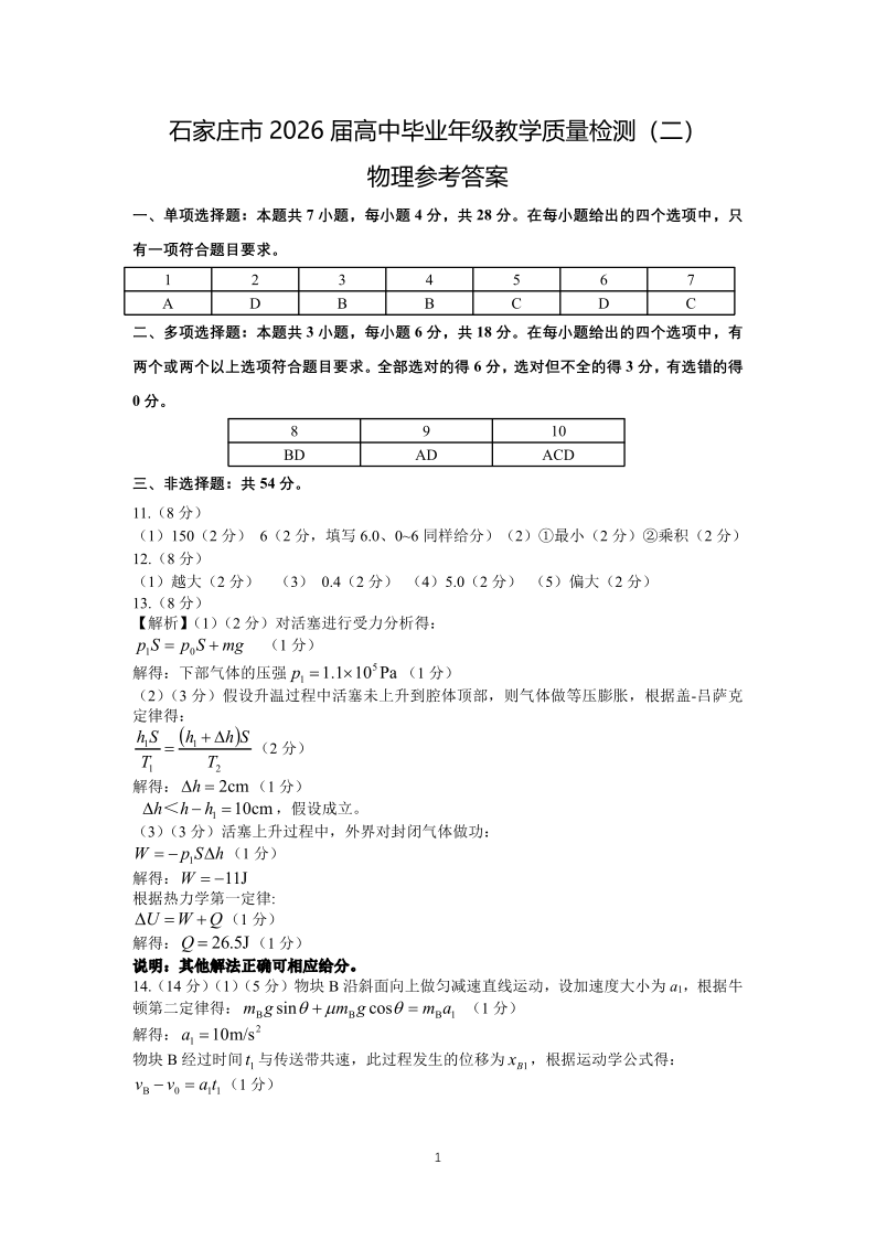 高三物理答案--河北省石家庄市2026届高三下学期教学质量检测(二)(石家庄二模)