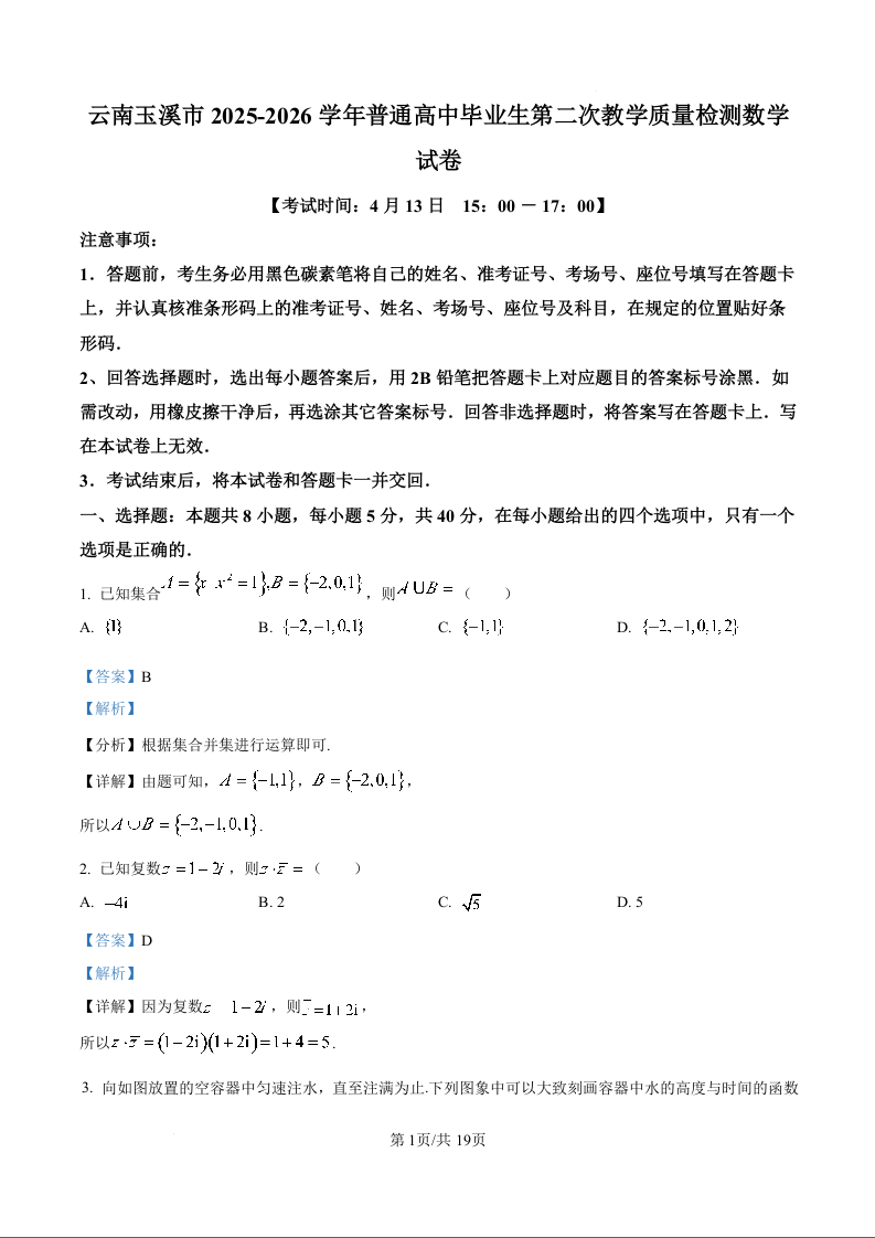 高三数学(解析版)--云南省玉溪市2026届高三下学期第二次教学质量检测(玉溪二模)