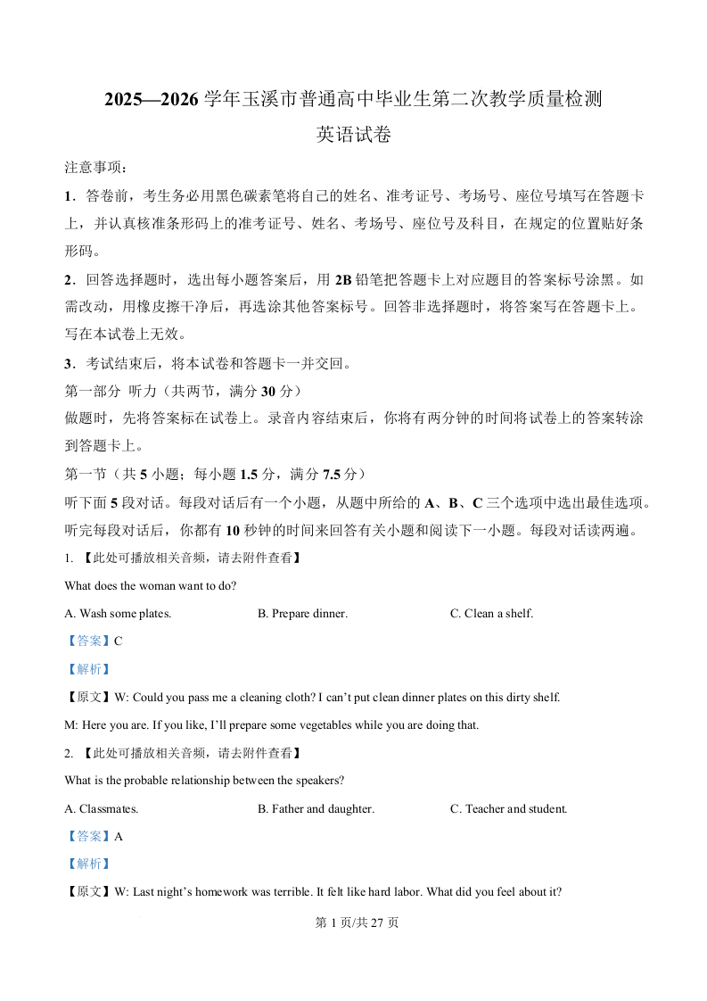 高三英语(解析版)--云南省玉溪市2026届高三下学期第二次教学质量检测(玉溪二模)