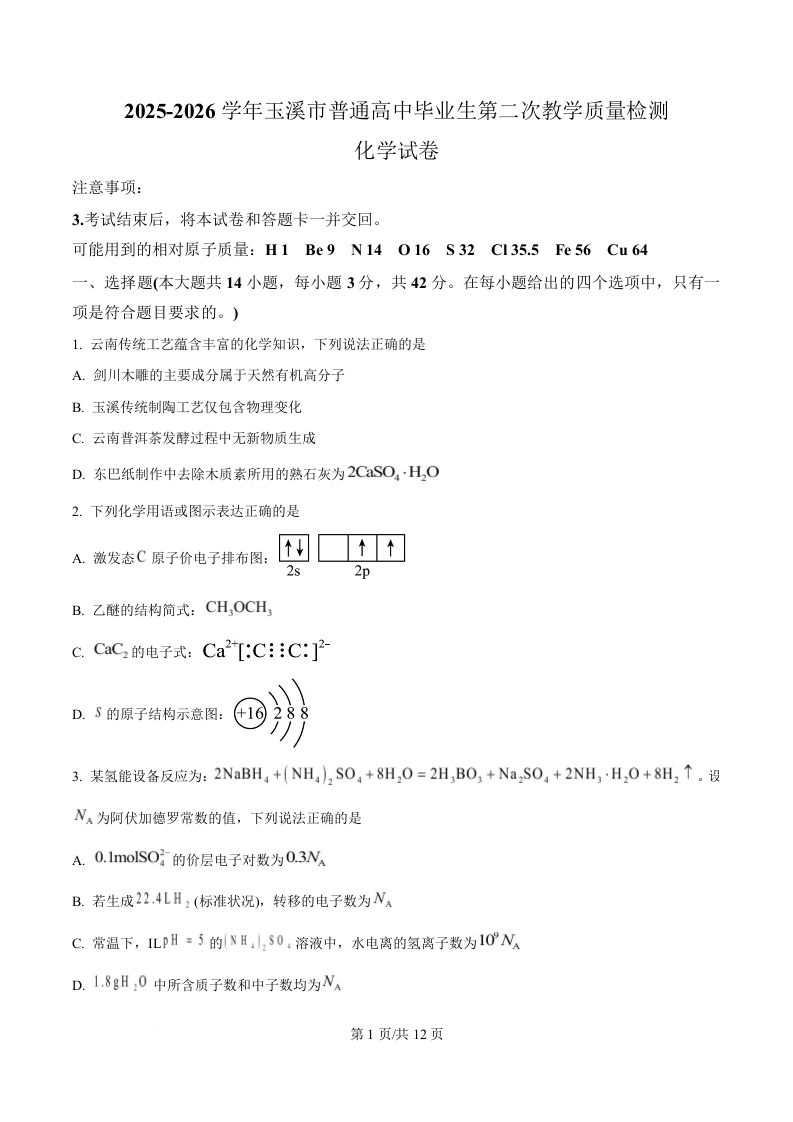 高三化学(原卷版)--云南省玉溪市2026届高三下学期第二次教学质量检测(玉溪二模)