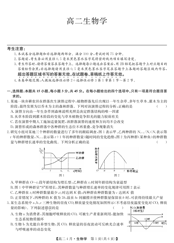 高二生物--安徽省县中联盟2025-2026学年高二年级下学期4月联考