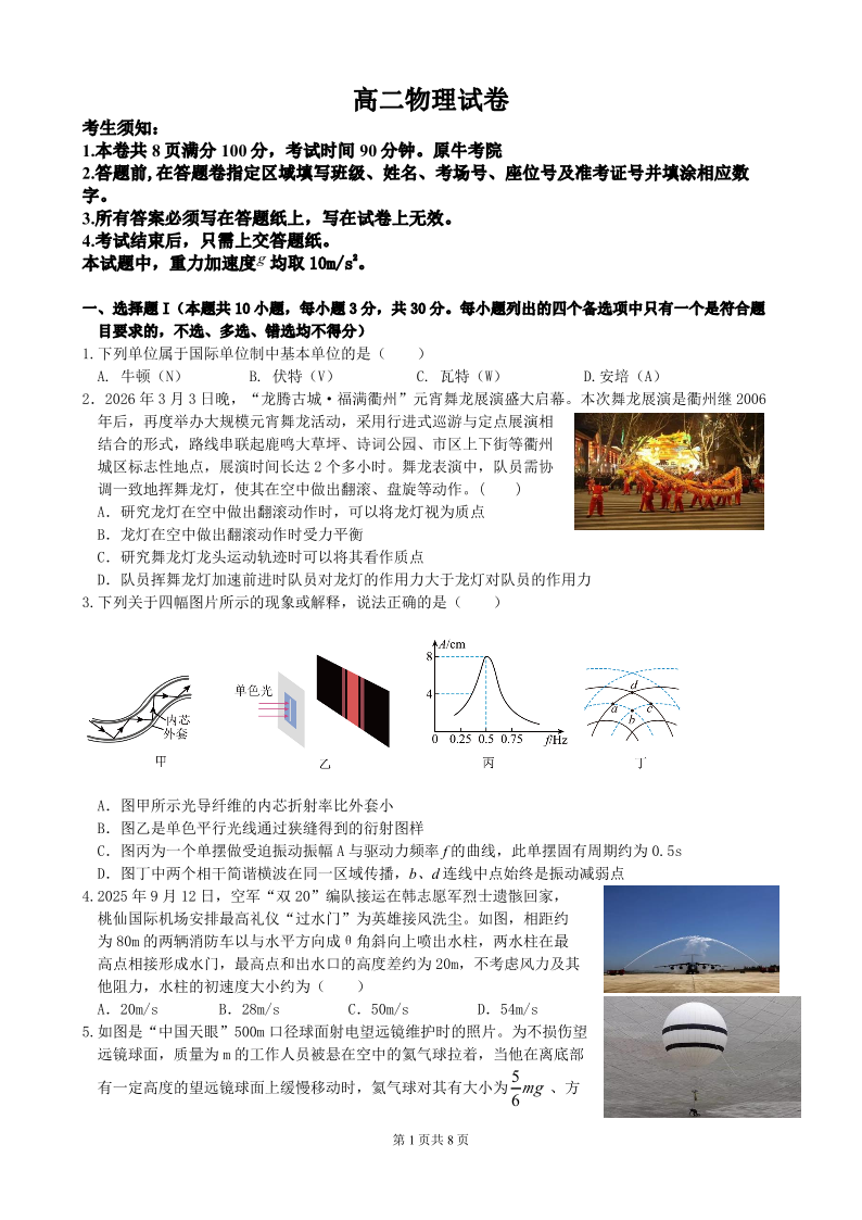 高二物理--浙江衢州五校联考2025-2026学年高二下学期期中考