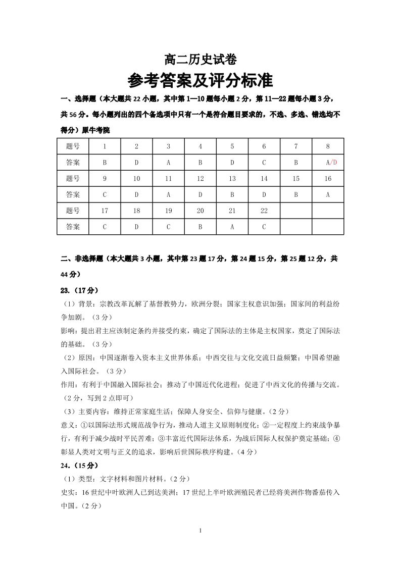 高二历史答案--浙江衢州五校联考2025-2026学年高二下学期期中考